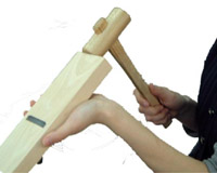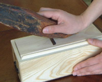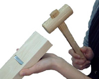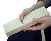 2、削り器の刃の調整 削り器の刃を木槌などで軽く叩いて調整します。 削り器の上部を木槌などで叩くと刃が引っ込み、下部を叩くと刃が出ます。 一旦すべて引っ込めた状態から少しずつ下部を叩いて、薄く削れるように 調整してください。指で触ってみて僅かに触るくらい。但し刃に触る時は 必ず刃に対して直角に指を当ててください。平行に触ると指を切る恐れが ありますので注意してください。
