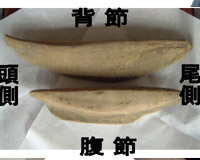 3、鰹節の向き 鰹節には“目”があります。逆向き(逆目)に削ると粉になります。ここでは、前に押して削る時を説明します。 削り器の刃先を自分の方に向け、鰹節の尾側を先に向け、頭の方から削ります。頭側と尾側の見分け方は写真を参考にしてください。 |