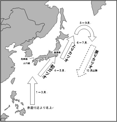 カツオは、北緯40度から南緯40度までの広大な帯状の水域に分布しており、いつも群れをなし、季節によって移動する回遊魚です。中でも水温17℃から32℃、塩分濃度約3.2%、透明度20m以上の清浄な水域の表層100mまでを好んで回遊します。日本での猟期は3月ごろ九州南部で始まり、5月ごろ本州中部、8〜9月ごろ北海道南部で終わります。春から秋にかけて黒潮に乗って北上しながら大回遊することが知られています。