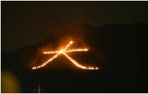 | ■五山の送り火(8月16日(金)、午後8時より) 京都の夏の夜を演出する「京都五山送り火」。夜空に燃え盛る五山の送り火は、お盆の精霊を送る 宗教行事ですが、京都の夏の風物詩として有名です。当日の夜、市中は独特の厳粛なムードに包 まれ、鴨川畔の鑑賞スポットには全国から多くの観光客が集います。 点火時間は午後8時より、各山とも約30分間。 まず東山如意ヶ獄に「大」の字が浮かび上がり、 続いて松ヶ崎の西山に「妙」・東山に「法」、 西賀茂船山に「船形」、衣笠大北山に「左大文字」、 最後に嵯峨曼茶羅山に「鳥居形」が点ります。 五山の送り火は、京都の夏の終焉を飾る行事でもあります。 |